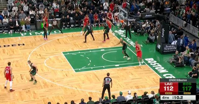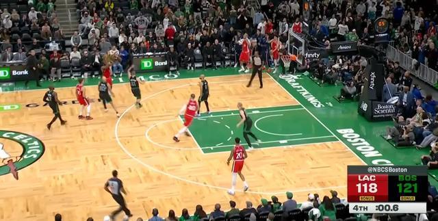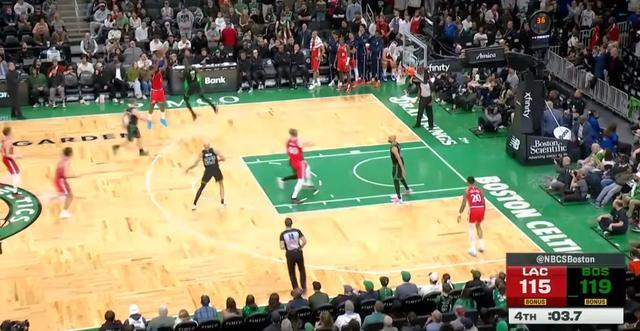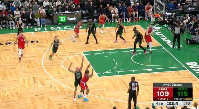 快船客场对阵凯尔特人比赛的最后21.8秒,詹姆斯-哈登造成三分犯规走上罚球线,此时快船落后6分,比赛悬念已然不大,即便哈登三罚全中仍落后3分,比赛进入战术犯规的环节,只要凯尔特人不犯错,快船很难有机会。