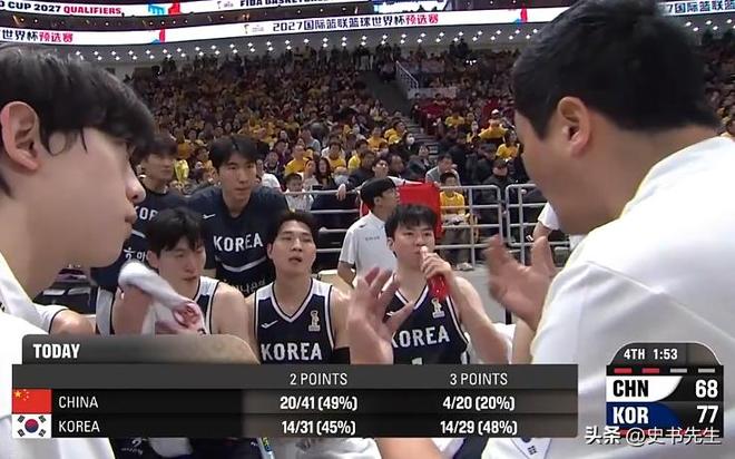 这场比赛,中国男篮几乎全程被韩国队“压着打”,韩国男篮似乎依旧坚持其擅长的“小快灵”打法,三分投射精准率高,还能够快速突破中国男篮的防守。