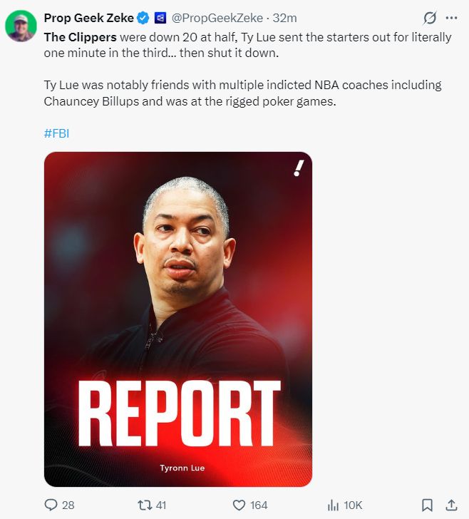 美记Prop Geek Zeke写道:快船半场落后20分,第三节刚开场1分钟泰伦卢就换下主力叫停比赛。提醒大家,泰伦卢与多位被起诉赌博的主教练的关系密切,他也参与了那些扑克游戏。。