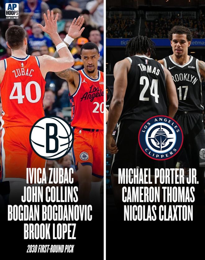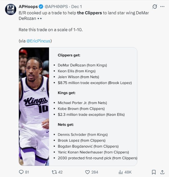美媒APHoos为快船建议了多笔交易,第一笔是快船、国王、篮网进行交易,德罗赞、基翁-埃利斯、杰伦-威尔逊加盟快船。