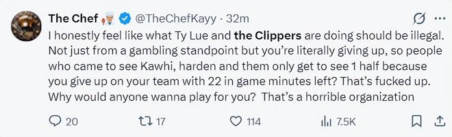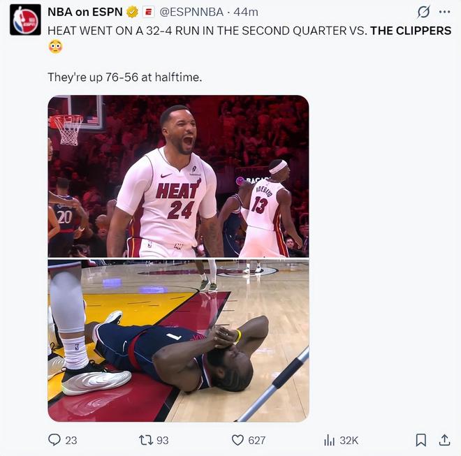 快船也直接登上了全美体育热搜,因为第二节快船被热火打出一波30-2的攻防浪潮,泰伦卢的暂停根本没能改变什么,感觉泰伦卢对球队更衣室的控制力已经非常低下。