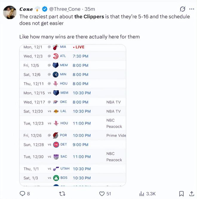美媒晒出快船接下来的赛程,老鹰、灰熊、森林、火箭、灰熊、雷霆、湖人、火箭,快船的赛程也非常艰难,快船到底能拿多少胜利呢?