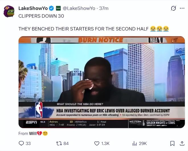 湖人媒体LkaerShowYo晒出帕金斯假哭的视频写道:快船以30分的差距换下了主力。三个哭脸,这分明是幸灾乐祸。